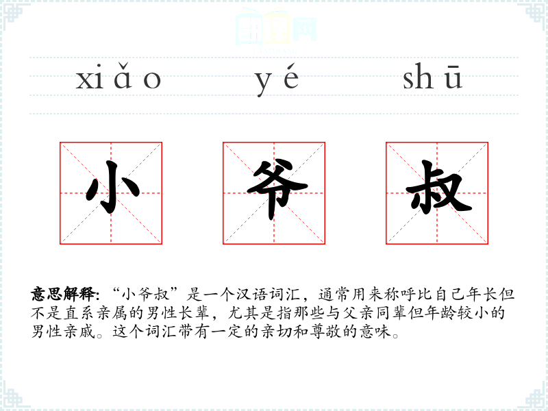 “小爷叔”是一个汉语词汇,通常用来称呼比自己年长但不是直系亲属的男性长辈,尤其是指那些与父亲同辈但年龄较小的男性亲戚。这个词汇带有一定的亲切和尊敬的意味。