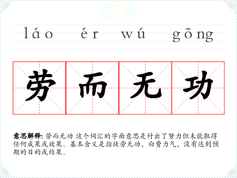 劳而无功 这个词汇的字面意思是付出了努力但未能取得任何成果或效果。基本含义是指徒劳无功,白费力气,没有达到预期的目的或结果。