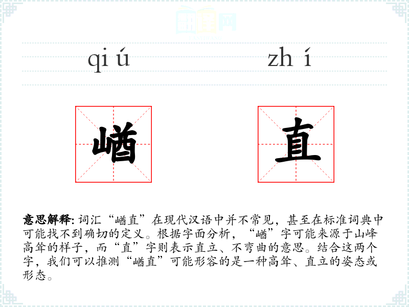词汇“崷直”在现代汉语中并不常见,甚至在标准词典中可能找不到确切的定义。根据字面分析,“崷”字可能来源于山峰高耸的样子,而“直”字则表示直立、不弯曲的意思。结合这两个字,我们可以推测“崷直”可能形容的是一种高耸、直立的姿态或形态。
