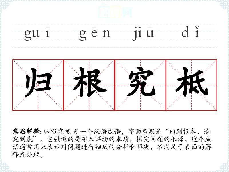 归根究柢 是一个汉语成语,字面意思是“回到根本,追究到底”。它强调的是深入事物的本质,探究问题的根源。这个成语通常用来表示对问题进行彻底的分析和解决,不满足于表面的解释或处理。