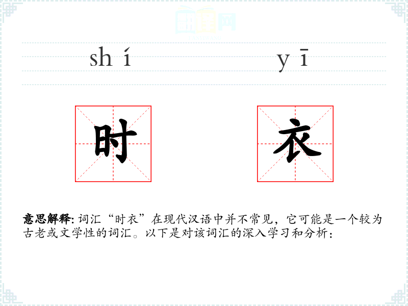 词汇“时衣”在现代汉语中并不常见,它可能是一个较为古老或文学性的词汇。以下是对该词汇的深入学*和分析:
