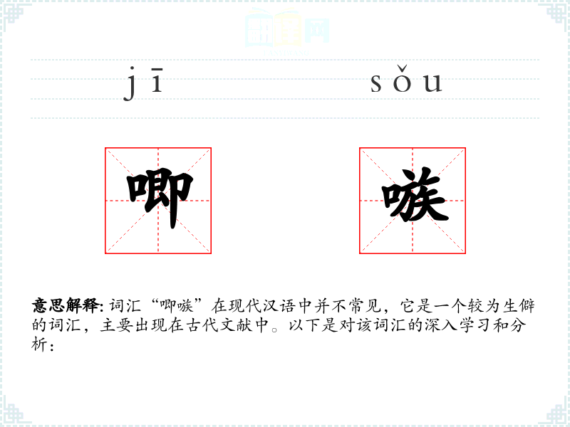 “唧嗾”(jī sǒu)的字面意思是形容鸟类鸣叫的声音,尤其是指鸟类发出的连续、细碎的叫声。在古代文献中,这个词常用来形容鸟类的鸣叫声,有时也用来比喻人的言语或声音。