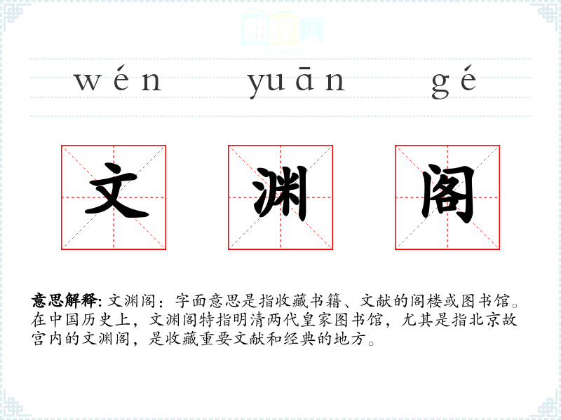 文渊阁:字面意思是指收藏书籍、文献的阁楼或图书馆。在**历史上,文渊阁特指明清两代皇家图书馆,尤其是指北京故宫内的文渊阁,是收藏重要文献和经典的地方。