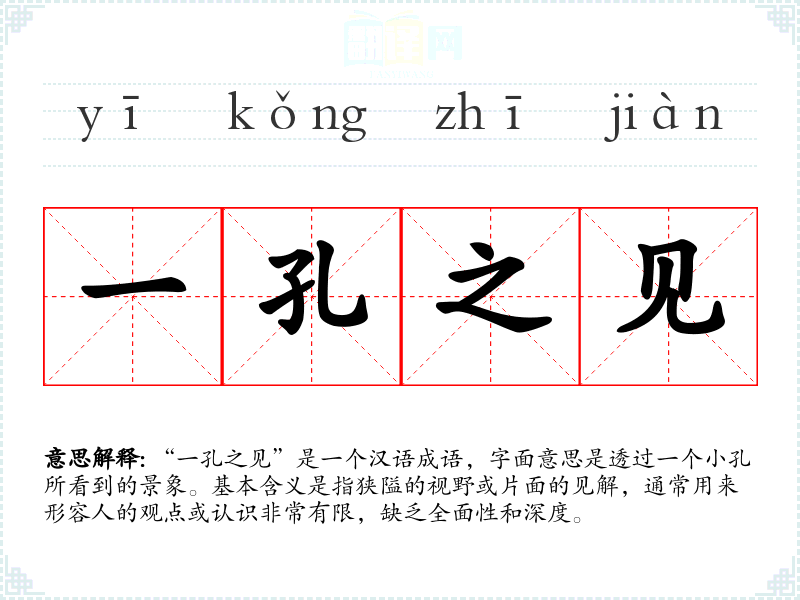 “一孔之见”是一个汉语成语,字面意思是透过一个小孔所看到的景象。基本含义是指狭隘的视野或片面的见解,通常用来形容人的观点或认识非常有限,缺乏全面性和深度。