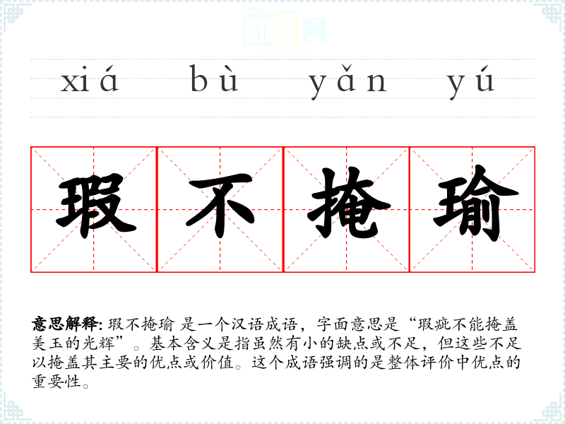 瑕不掩瑜 是一个汉语成语,字面意思是“瑕疵不能掩盖美玉的光辉”。基本含义是指虽然有小的缺点或不足,但这些不足以掩盖其主要的优点或价值。这个成语强调的是整体评价中优点的重要性。