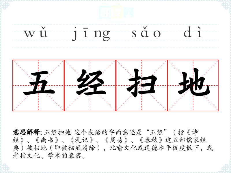 五经扫地 这个成语的字面意思是“五经”(指《诗经》、《尚书》、《礼记》、《周易》、《春秋》这五部儒家经典)被扫地(即被彻底清除),比喻文化或道德水平极度低下,或者指文化、学术的衰落。