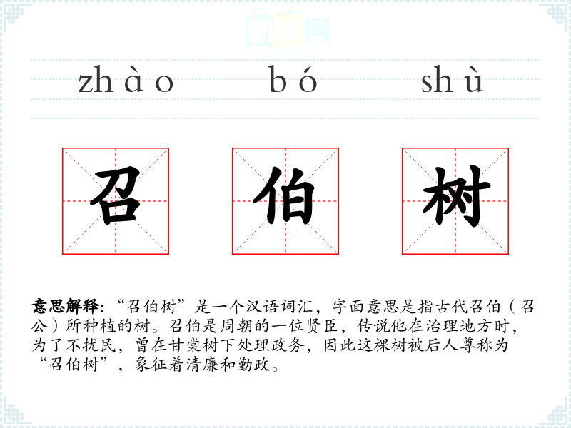 “召伯树”是一个汉语词汇,字面意思是指古代召伯(召公)所种植的树。召伯是周朝的一位贤臣,传说他在治理地方时,为了不扰民,曾在甘棠树下处理政务,因此这棵树被后人尊称为“召伯树”,象征着清廉和勤政。