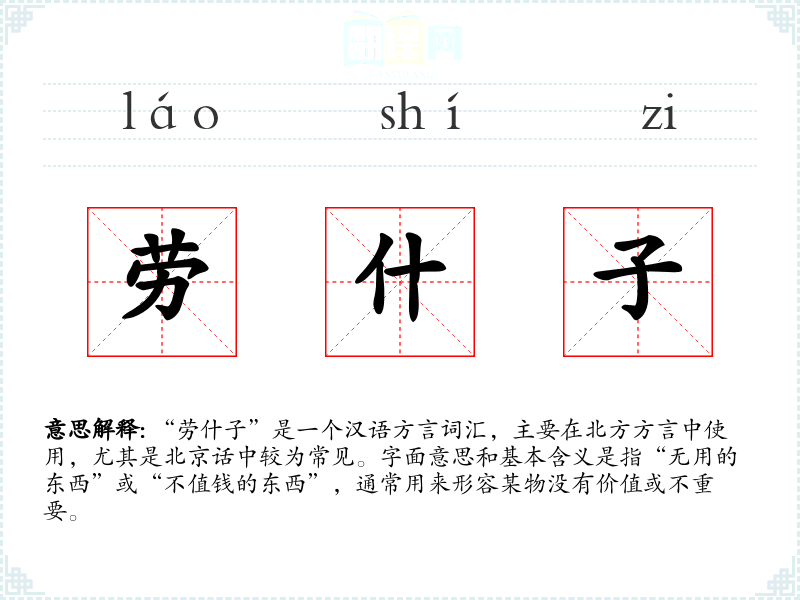 “劳什子”是一个汉语方言词汇,主要在北方方言中使用,尤其是北京话中较为常见。字面意思和基本含义是指“无用的东西”或“不值钱的东西”,通常用来形容某物没有价值或不重要。
