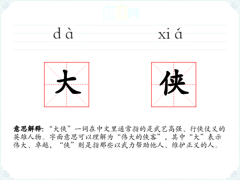 “大侠”一词在中文里通常指的是武艺高强、行侠仗义的英雄人物。字面意思可以理解为“伟大的侠客”,其中“大”表示伟大、卓越,“侠”则是指那些以武力帮助他人、维护正义的人。