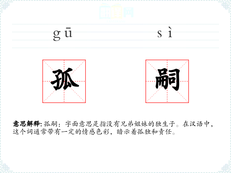 孤嗣:字面意思是指没有兄弟姐妹的独生子。在汉语中,这个词通常带有一定的情感色彩,暗示着孤独和责任。