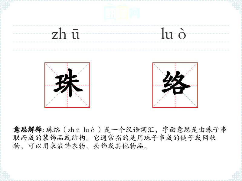 同义词:珠串、珠链、珠饰 反义词:无(珠络本身是具体的装饰品,不易找到直接的反义词)