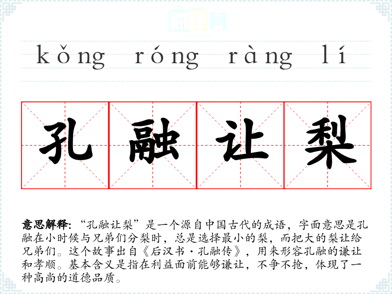 “孔融让梨”是一个源自**古代的成语,字面意思是孔融在小时候与兄弟们分梨时,总是选择最小的梨,而把大的梨让给兄弟们。这个故事出自《后汉书·孔融传》,用来形容孔融的谦让和孝顺。基本含义是指在利益面前能够谦让,不争不抢,体现了一种高尚的道德品质。