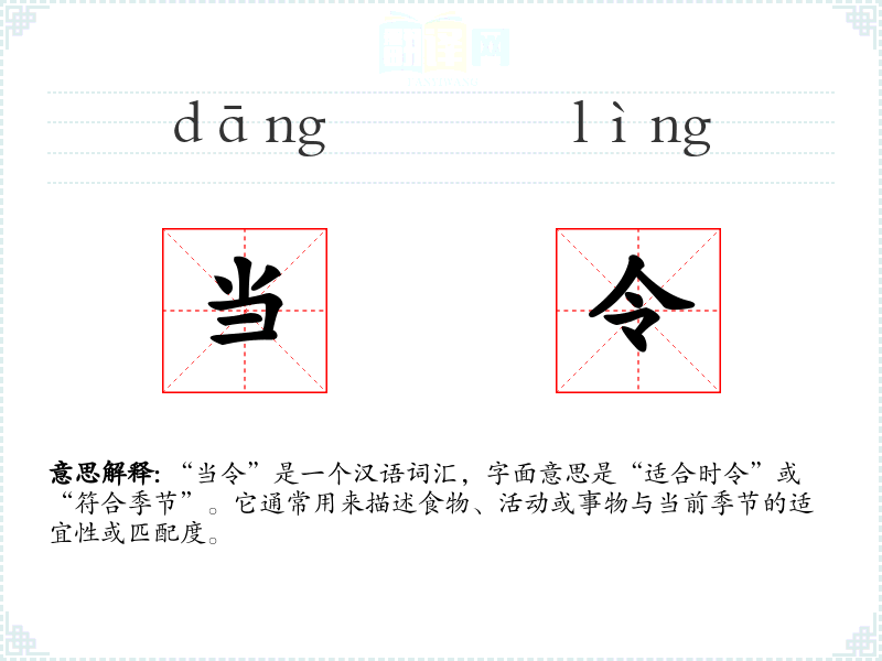 “当令”是一个汉语词汇,字面意思是“适合时令”或“符合季节”。它通常用来描述食物、活动或事物与当前季节的适宜性或匹配度。