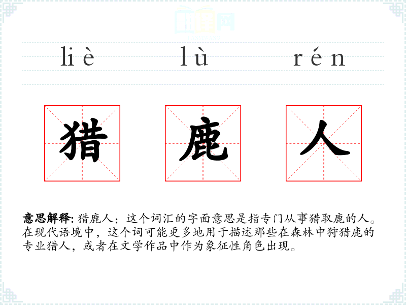 猎鹿人:这个词汇的字面意思是指专门从事猎取鹿的人。在现代语境中,这个词可能更多地用于描述那些在森林中狩猎鹿的专业猎人,或者在文学作品中作为象征性角色出现。