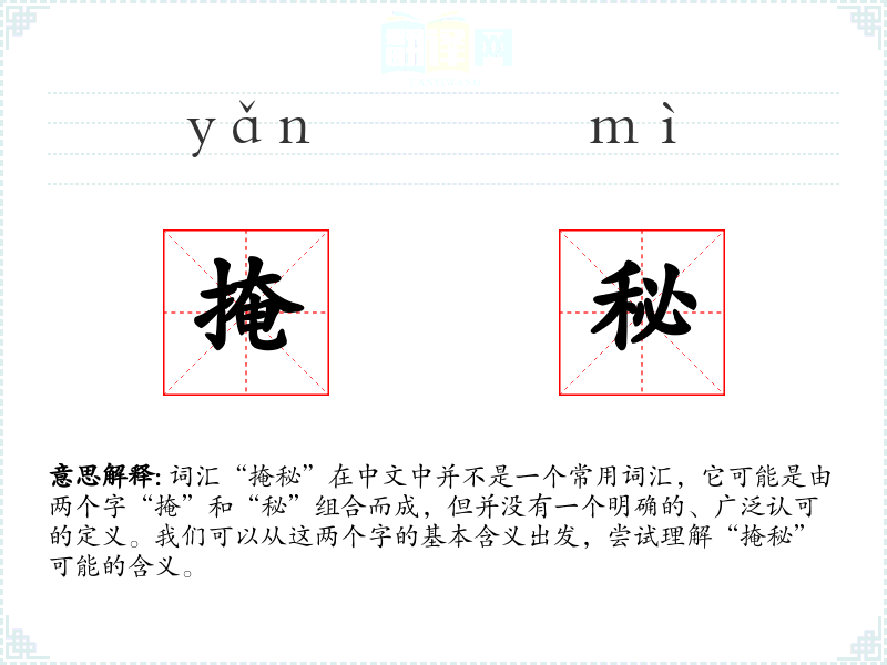 词汇“掩秘”在中文中并不是一个常用词汇,它可能是由两个字“掩”和“秘”组合而成,但并没有一个明确的、广泛认可的定义。我们可以从这两个字的基本含义出发,尝试理解“掩秘”可能的含义。