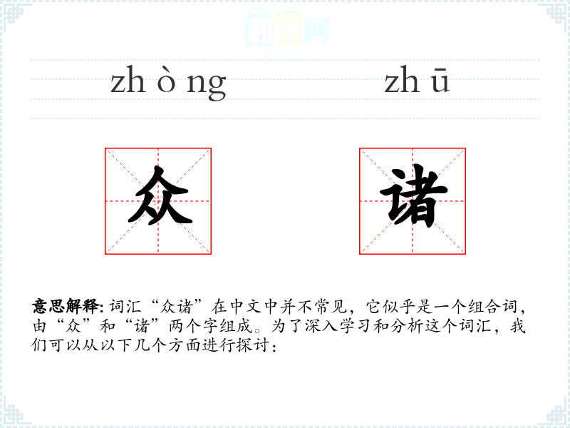 词汇“众诸”在中文中并不常见,它似乎是一个组合词,由“众”和“诸”两个字组成。为了深入学*和分析这个词汇,我们可以从以下几个方面进行探讨: