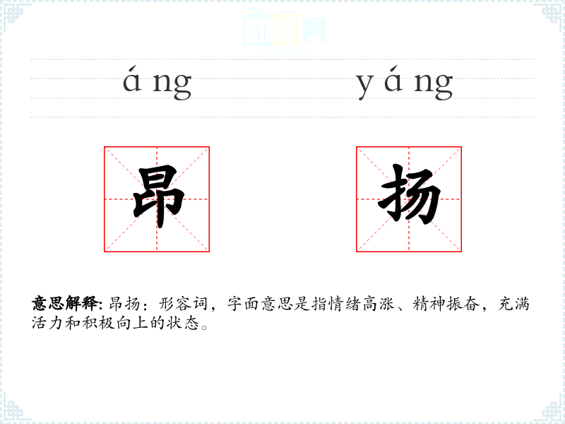 昂扬:形容词,字面意思是指情绪高涨、精神振奋,充满活力和积极向上的状态。