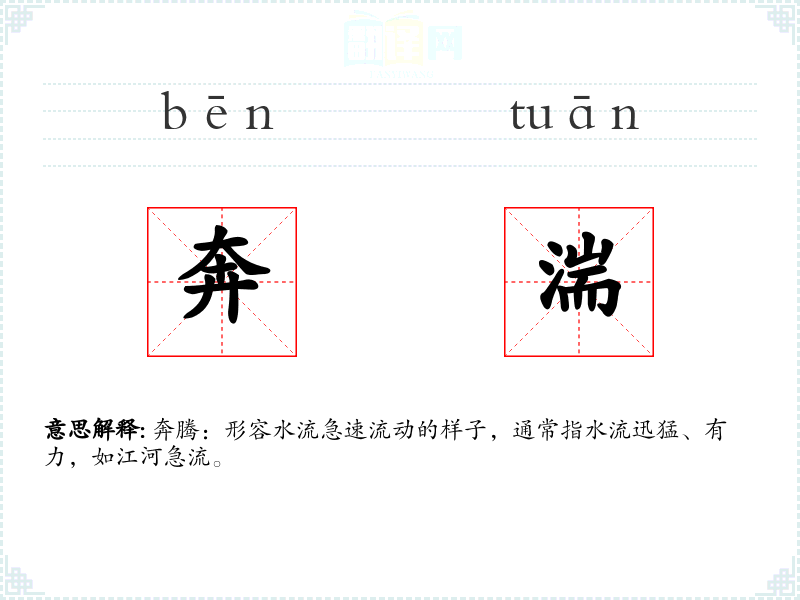 - 专业领域:在地理学或水利工程中,“奔腾”特指水流的动态特征,用于描述水流的能量和速度。