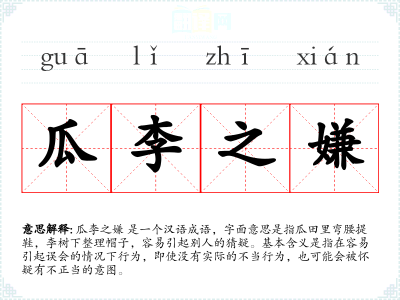 瓜李之嫌 是一个汉语成语,字面意思是指瓜田里弯腰提鞋,李树下整理帽子,容易引起别人的猜疑。基本含义是指在容易引起误会的情况下行为,即使没有实际的不当行为,也可能会被怀疑有不正当的意图。