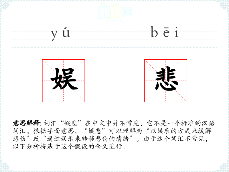 词汇“娱悲”在中文中并不常见,它不是一个标准的汉语词汇。根据字面意思,“娱悲”可以理解为“以娱乐的方式来缓解悲伤”或“通过娱乐来转移悲伤的情绪”。由于这个词汇不常见,以下分析将基于这个假设的含义进行。