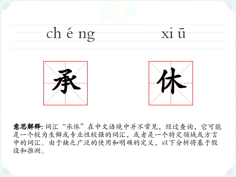 词汇“承休”在中文语境中并不常见,经过查询,它可能是一个较为生僻或专业性较强的词汇,或者是一个特定领域或方言中的词汇。由于缺乏广泛的使用和明确的定义,以下分析将基于假设和推测。