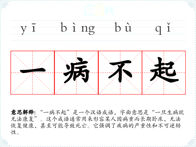 “一病不起”是一个汉语成语,字面意思是“一旦生病就无法康复”。这个成语通常用来形容某人因病重而长期卧床,无法恢复健康,甚至可能导致死亡。它强调了疾病的严重性和不可逆转性。