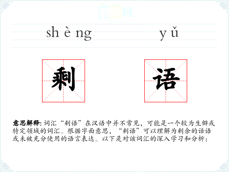 词汇“剩语”在汉语中并不常见,可能是一个较为生僻或特定领域的词汇。根据字面意思,“剩语”可以理解为剩余的话语或未被充分使用的语言表达。以下是对该词汇的深入学习和分析: