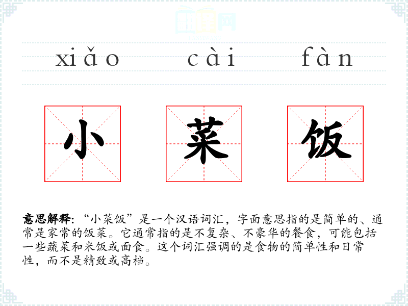 “小菜饭”是一个汉语词汇,字面意思指的是简单的、通常是家常的饭菜。它通常指的是不复杂、不豪华的餐食,可能包括一些蔬菜和米饭或面食。这个词汇强调的是食物的简单性和日常性,而不是精致或高档。