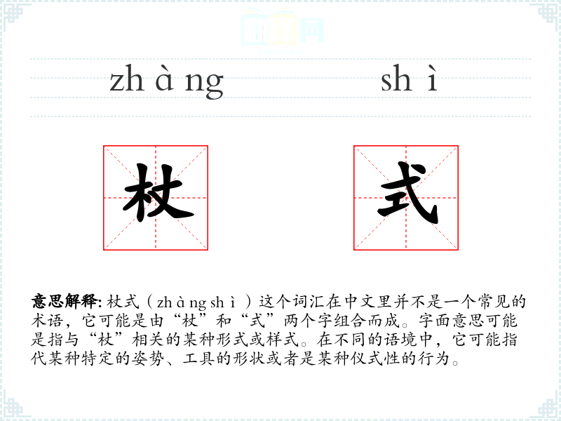 “杖式”这个词汇可能是由现代人根据“杖”和“式”两个字组合创造出来的,用于描述与杖相关的特定形式或样式。在古代文献或传统语言中,可能没有直接对应的词汇。