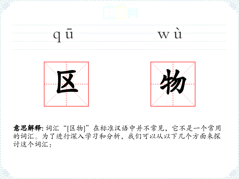 由于“[区物]”不是一个标准的汉语词汇,我们无法给出一个确切的基本定义。它可能是某个特定领域或方言中的词汇,或者是拼写错误或打字错误。