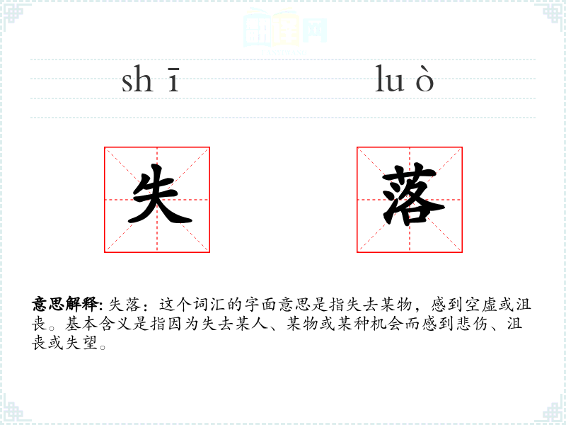 - 文学:在文学作品中,“失落”常用来描述角色的内心世界,如《红楼梦》中贾宝玉对林黛玉的失落感。