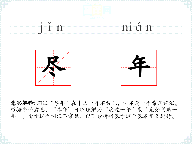 词汇“尽年”在中文中并不常见,它不是一个常用词汇。根据字面意思,“尽年”可以理解为“度过一年”或“充分利用一年”。由于这个词汇不常见,以下分析将基于这个基本定义进行。