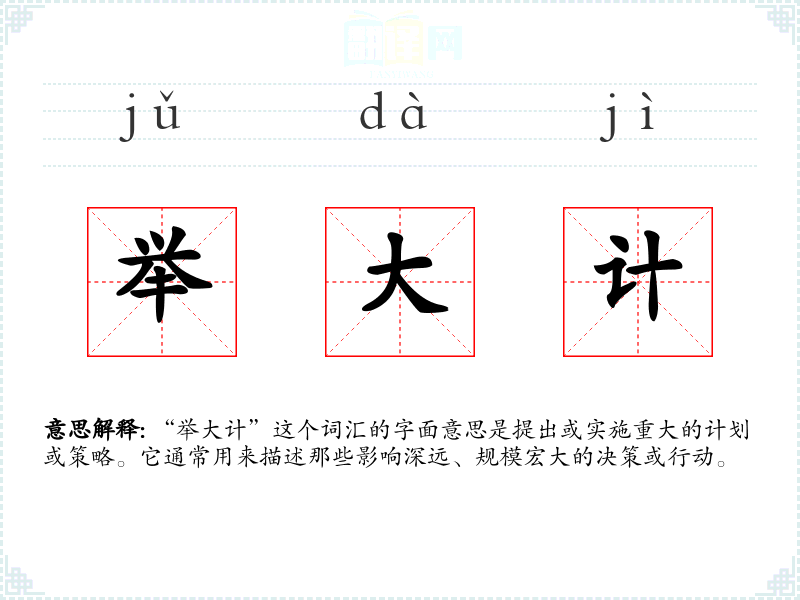 “举大计”这个词汇的字面意思是提出或实施重大的计划或策略。它通常用来描述那些影响深远、规模宏大的决策或行动。