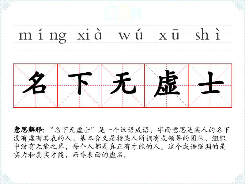 “名下无虚士”是一个汉语成语,字面意思是某人的名下没有虚有其表的人。基本含义是指某人所拥有或领导的团队、组织中没有无能之辈,每个人都是真正有才能的人。这个成语强调的是实力和真实才能,而非表面的虚名。
