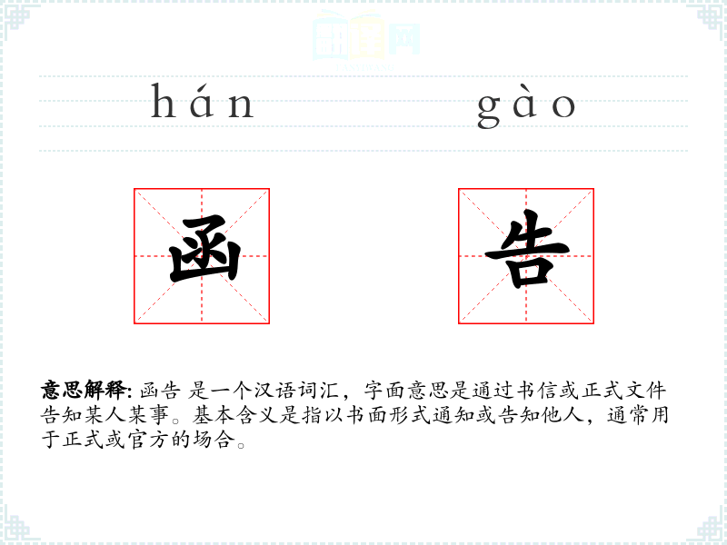 函告 是一个汉语词汇,字面意思是通过书信或正式文件告知某人某事。基本含义是指以书面形式通知或告知他人,通常用于正式或官方的场合。