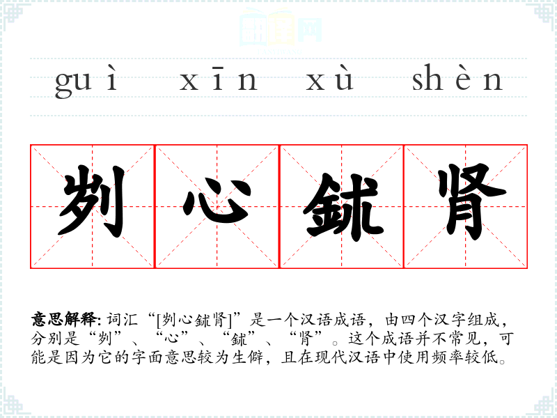 词汇“[刿心鉥肾]”是一个汉语成语,由四个汉字组成,分别是“刿”、“心”、“鉥”、“肾”。这个成语并不常见,可能是因为它的字面意思较为生僻,且在现代汉语中使用频率较低。