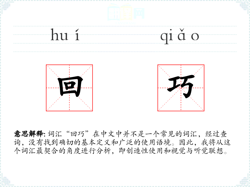 词汇“回巧”在中文中并不是一个常见的词汇,经过查询,没有找到确切的基本定义和广泛的使用语境。因此,我将从这个词汇最契合的角度进行分析,即创造性使用和视觉与听觉联想。