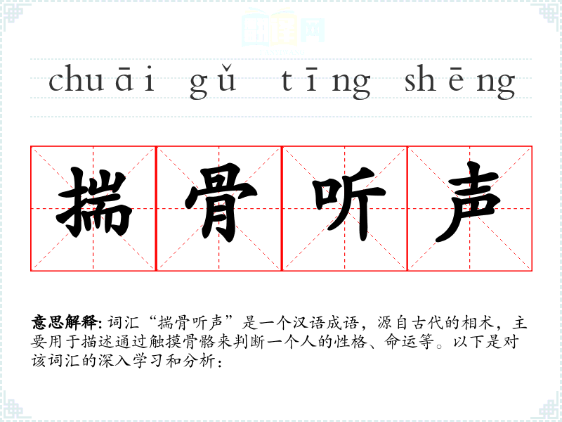 - 理解:揣骨听声是一个充满历史和文化色彩的词汇,反映了古代人们对命运的探求和神秘主义的倾向。
