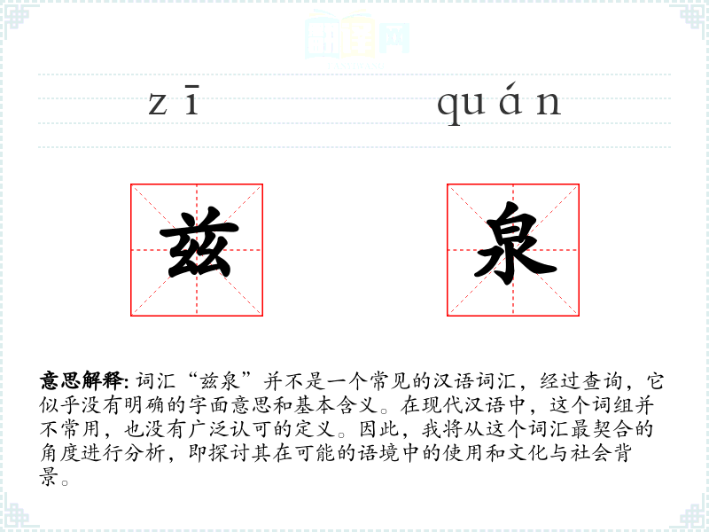 由于“兹泉”不是一个标准词汇,我们无法提供一个确切的基本定义。它可能是某个特定地区或文化中的术语,或者是某个特定文献中的用语。