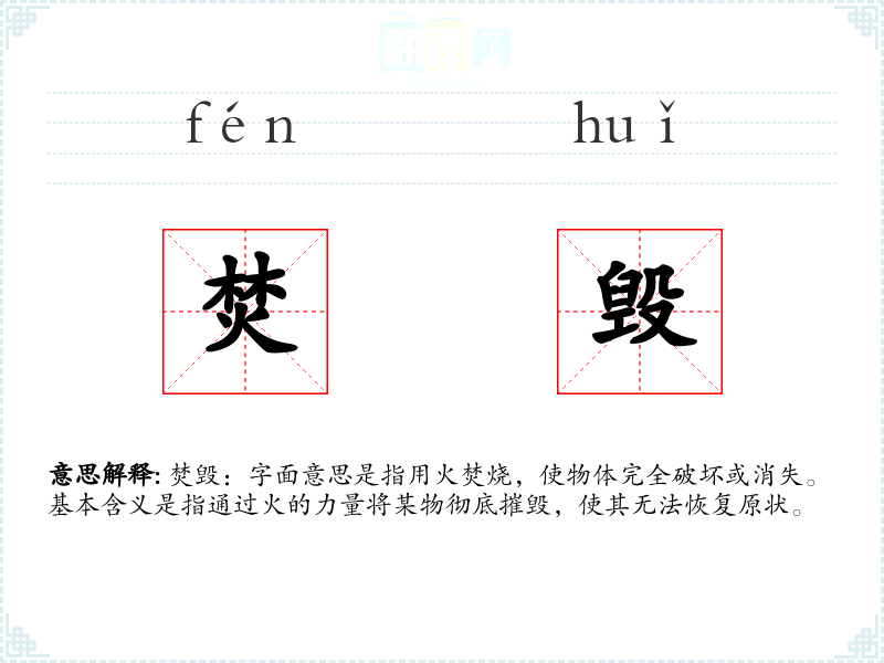 焚毁:字面意思是指用火焚烧,使物体完全破坏或消失。基本含义是指通过火的力量将某物彻底摧毁,使其无法恢复原状。