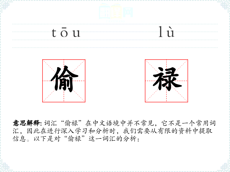 词汇“偷禄”在中文语境中并不常见,它不是一个常用词汇,因此在进行深入学*和分析时,我们需要从有限的资料中提取信息。以下是对“偷禄”这一词汇的分析: