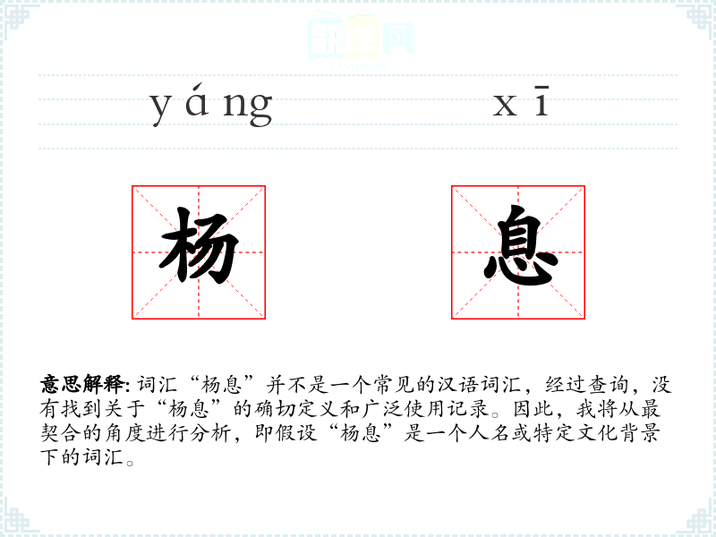 由于“杨息”不是一个标准词汇,我们可以假设它可能是一个人名,或者是一个特定社群、文学作品中的专有名词。在这种情况下,它的基本含义可能与持有这个名字的人或概念相关。