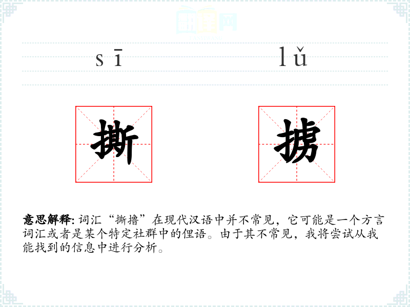 词汇“撕撸”在现代汉语中并不常见,它可能是一个方言词汇或者是某个特定社群中的俚语。由于其不常见,我将尝试从我能找到的信息中进行分析。