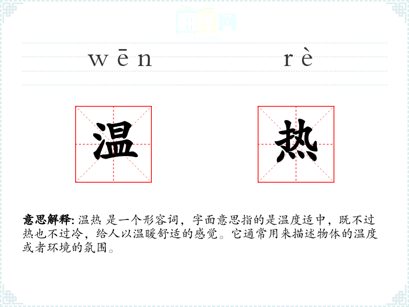 温热 是一个形容词,字面意思指的是温度适中,既不过热也不过冷,给人以温暖舒适的感觉。它通常用来描述物体的温度或者环境的氛围。