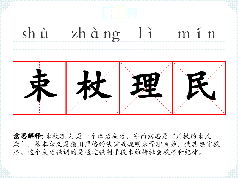 束杖理民 是一个汉语成语,字面意思是“用杖约束民众”,基本含义是指用严格的法律或规则来管理百姓,使其遵守秩序。这个成语强调的是通过强制手段来维持社会秩序和纪律。