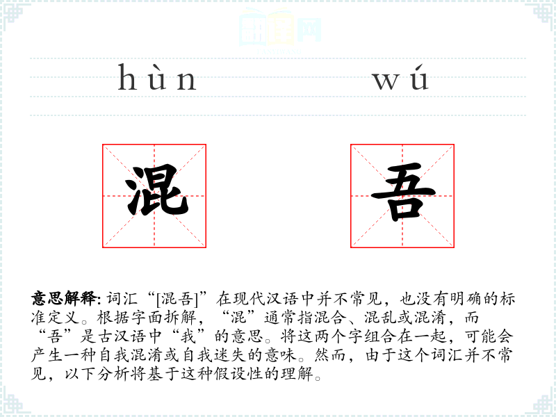 词汇“[混吾]”在现代汉语中并不常见,也没有明确的标准定义。根据字面拆解,“混”通常指混合、混乱或混淆,而“吾”是古汉语中“我”的意思。将这两个字组合在一起,可能会产生一种自我混淆或自我迷失的意味。然而,由于这个词汇并不常见,以下分析将基于这种假设性的理解。
