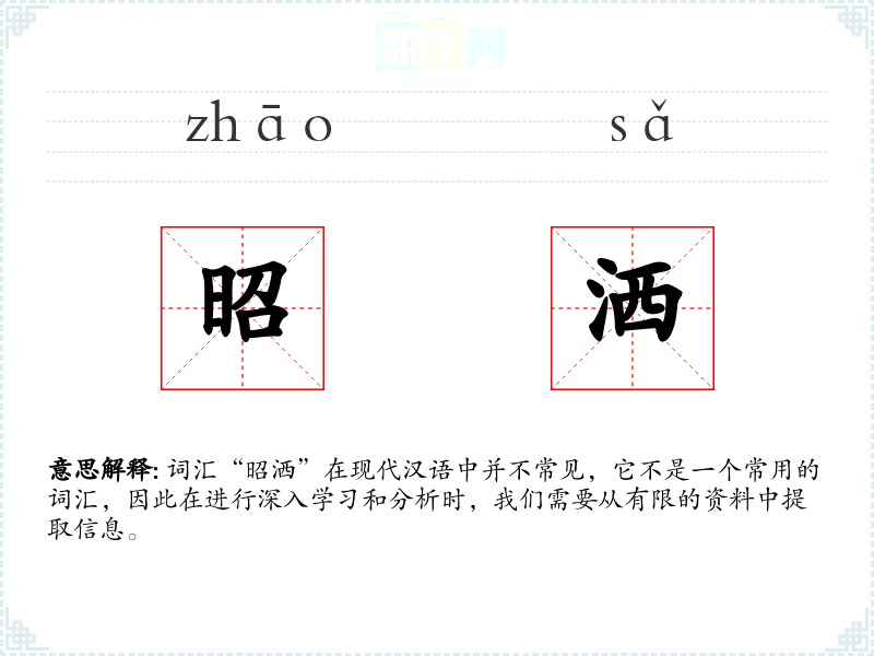 词汇“昭洒”在现代汉语中并不常见,它不是一个常用的词汇,因此在进行深入学习和分析时,我们需要从有限的资料中提取信息。