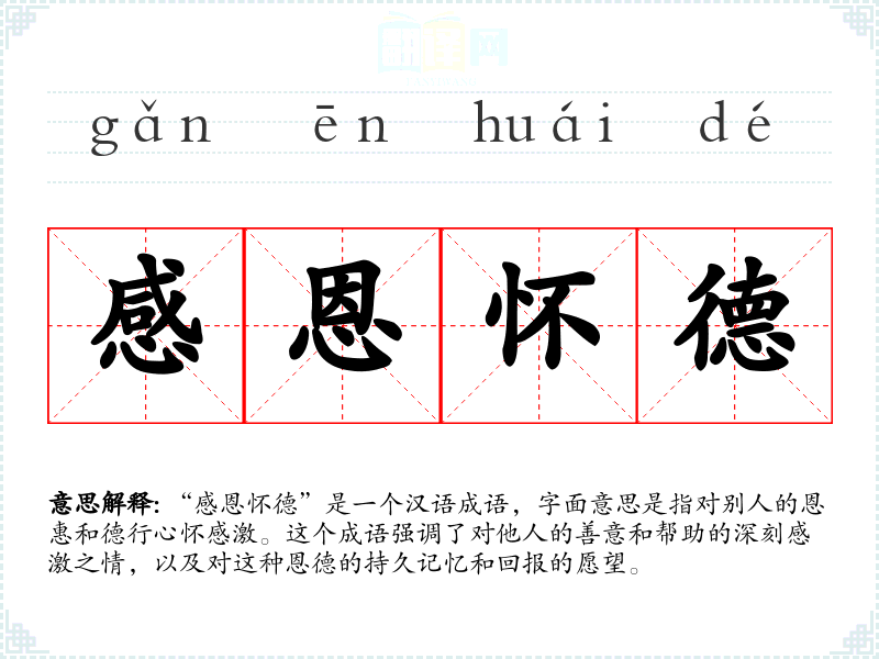 “感恩怀德”是一个汉语成语,字面意思是指对别人的恩惠和德行心怀感激。这个成语强调了对他人的善意和帮助的深刻感激之情,以及对这种恩德的持久记忆和回报的愿望。