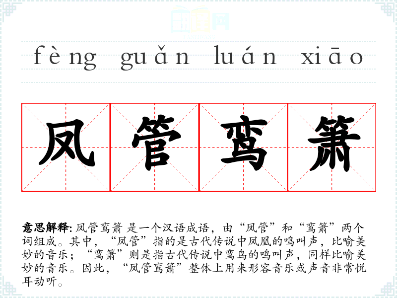 “凤管鸾箫”这个成语源自**古代的神话传说,凤凰和鸾鸟都是吉祥的象征,它们的鸣叫声被认为是极其美妙的。随着时间的推移,这个成语被用来形容任何悦耳动听的音乐或声音。