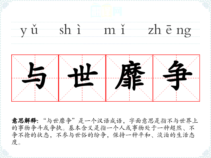 “与世靡争”这个成语的词源较为古老,源自**古代的哲学思想,特别是道家的无为而治和儒家的中庸之道。随着时间的推移,这个词汇逐渐被用来形容那些追求内心平和、不与世俗纷争的人。